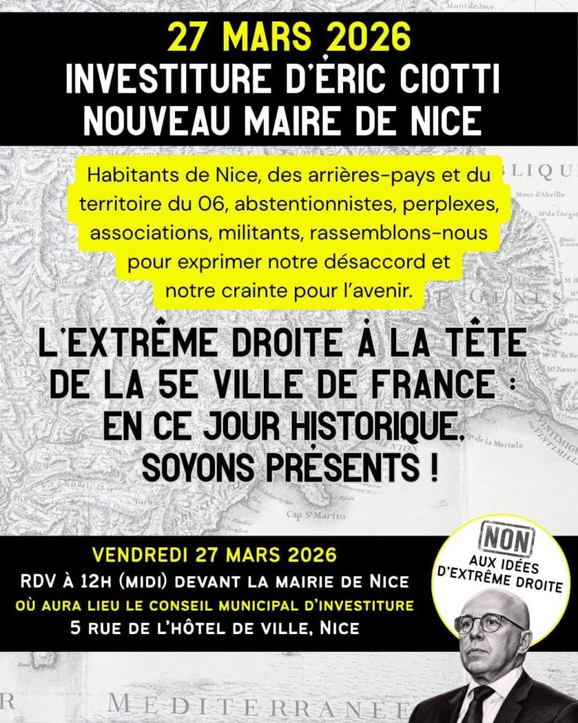 Communiqué collectif pour un rassemblement Vendredi 27 mars à 12h00 devant la mairie de Nice. Suite à l’agression par des neo-nazis de militant·es antifascistes à la suite du rassemblement organisé par la CGT Spectacles 06 lundi 24 mars, il est important de montrer que nous ne reculerons pas et que nous ferons tout notre possible pour nous opposer à la politique Ciottiste. Peyrat en son temps nous avait trouvé·es sur son chemin, ce sera la même chose pour le mandat à venir.