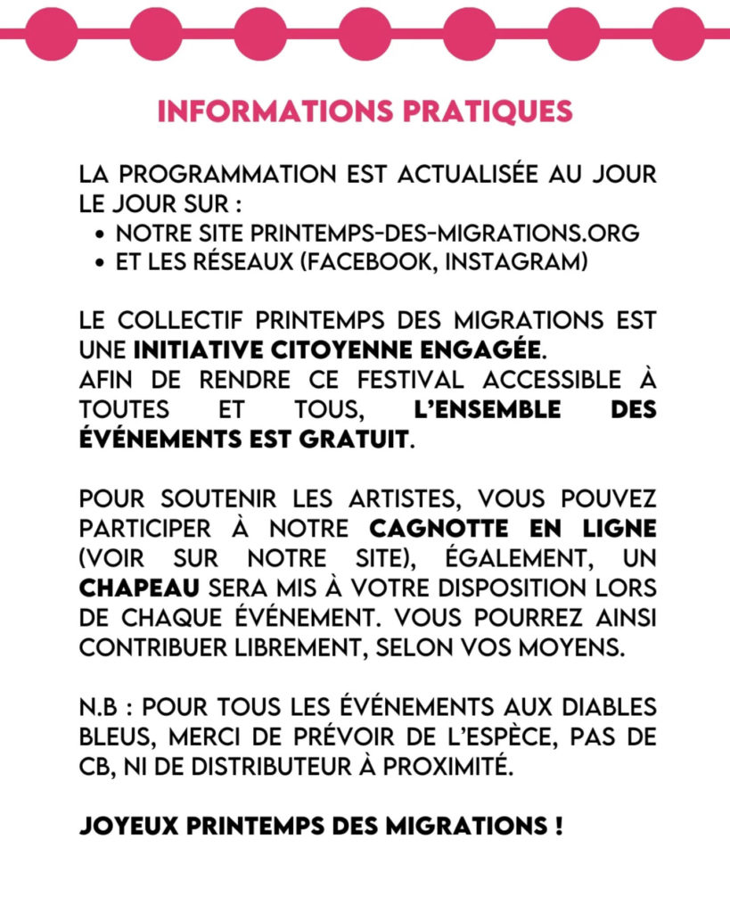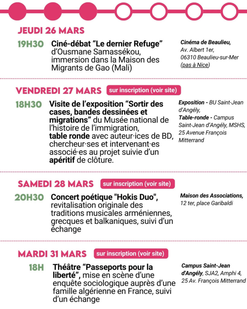 Le Printemps de Migrations revient à Nice pour sa 4ème édition. Etrange hasard du calendrier, collision improbable (ou pas) avec l’élection d’Eric Ciotti à la Mairie. Encore une fois, belle programmation – la migration dans toute sa diversité.